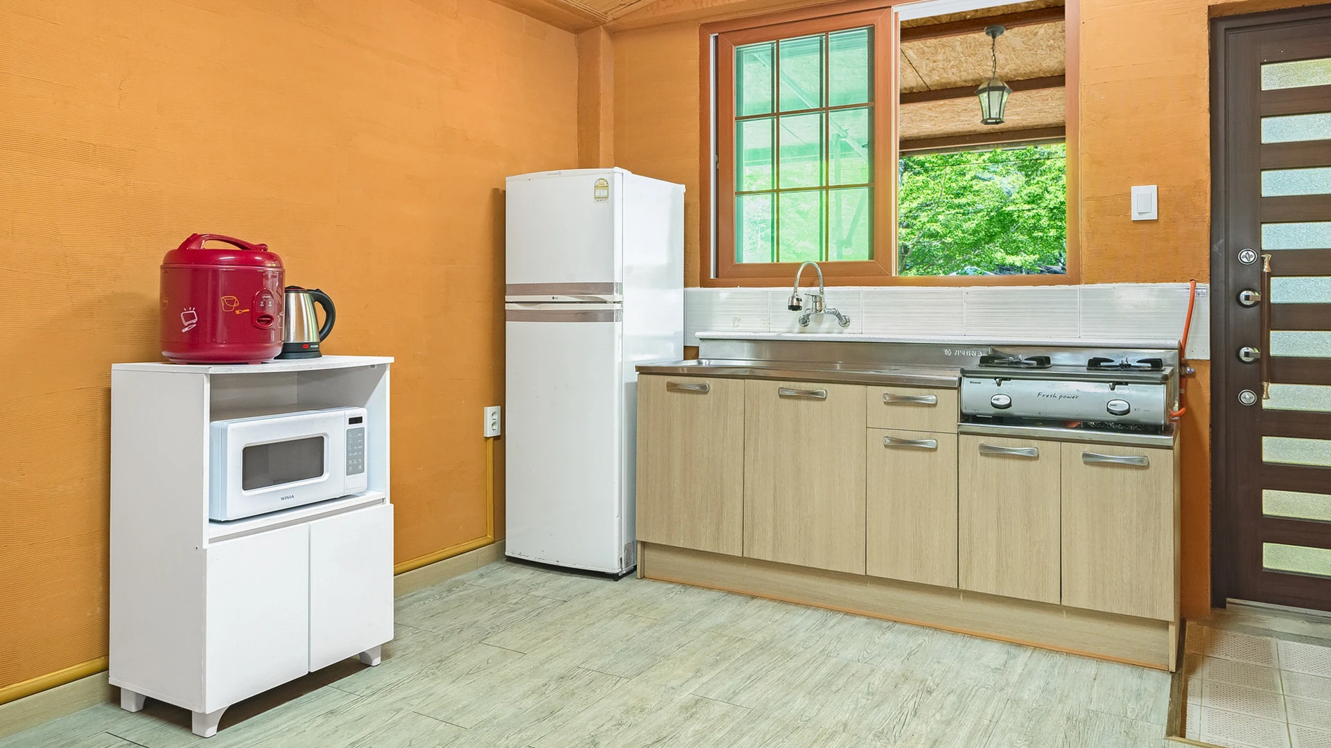 - 객실 집기품목 : TV, 냉장고, 에어컨, 취사시설/도구, 가스레인지, 전기밥솥, 커피포트, 전자레인지, 드라이기, 화장대, 샴푸, 바디워시, 치약, 비누, 타월, 금연, 와이파이, VOD, 욕실용품, 남녀공용, 단체