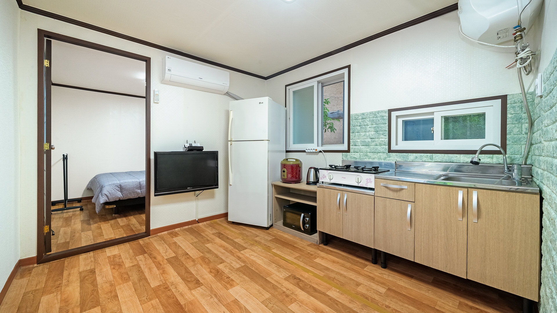 - 집기품목 : TV, 냉장고, 에어컨, 취사시설/도구, 가스레인지, 전기밥솥, 커피포트, 전자레인지, 드라이기, 화장대, 샴푸, 바디워시, 치약, 비누, 타월, 금연, 와이파이, VOD, 욕실용품, 남녀공용